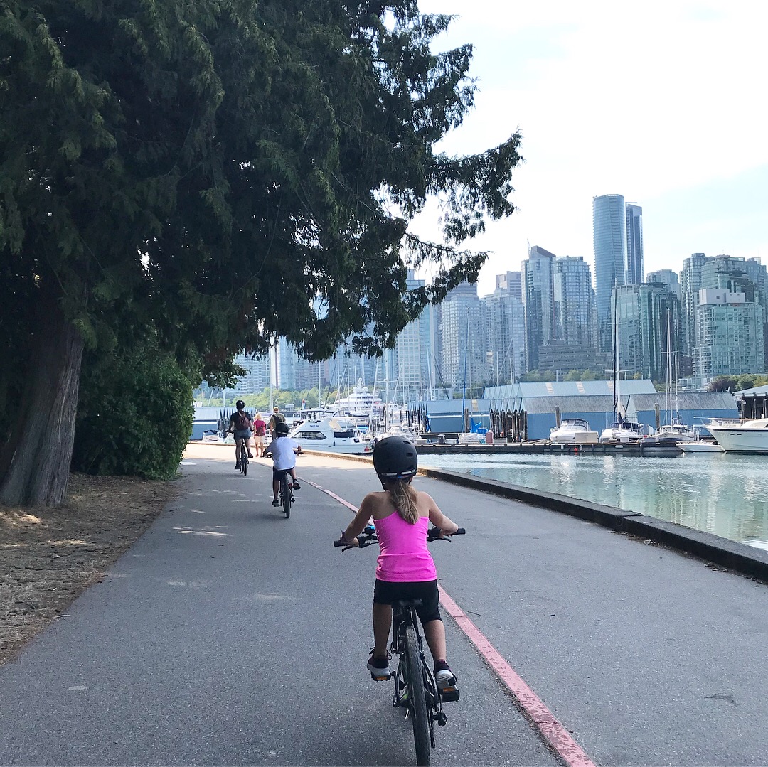 Gary and I are big fans of bike tours while traveling. You get to see a lot in a short amount of time. We like to do them early in our trips so that we can go back to any spots if we need to. We’ve done tours in Paris, Barcelona, Munich, two in London, and now Vancouver. The Cycle City Vancouver bike tour was Finley and Zane’s first bike tour. We were pretty confident that they would be okay after reading reviews and a description of the tour…and they were! Zane likes to stick close to the tour guide so he is basically a shadow to the guide and Finley does not fall far behind. The Grand Tour was a 5-hour tour with lots of little stops and a longer stop for lunch. The tour started downtown just a block from our hotel and took us through trails and forest in Stanley Park, along the Seawall, over to Granville Island for lunch, through the Olympic village, and more! Highly recommend it!